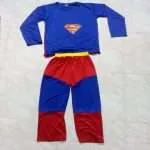 Blue jumpsuit has attached red boot covers w/ elastic band under foot